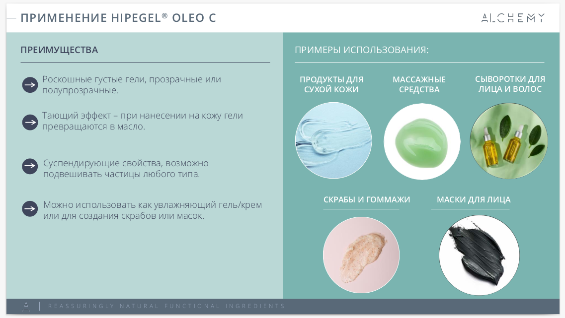 Гели на основе HIPEgel Oleo C по сравнению с рецептурами на Sucragel дают лучшее скольжение и приятную сенсорику. HIPEgel Oleo C позволяет создавать масляные гели с концентрацией масляной фазы 80-90%,обладающие уникальными легкими ощущениями на коже и "quick-break" эффектом (при нанесении на кожу гель превращается в масло, при добавлении воды — в эмульсию). Совместим со всеми типами масел, кроме высокополярных.